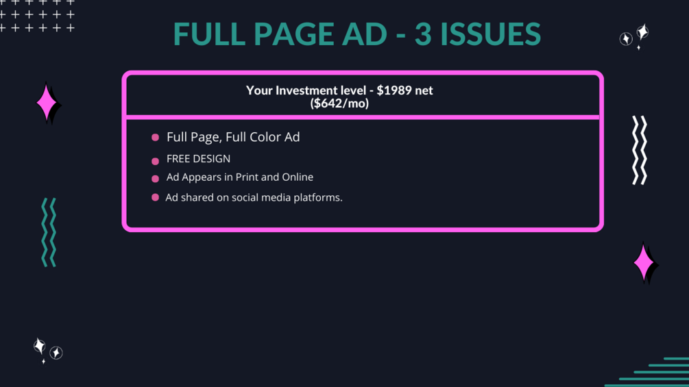 3 months of our Splash Marketing which includes both print and digital ads, physical copies of the magazine for your location or distribution.